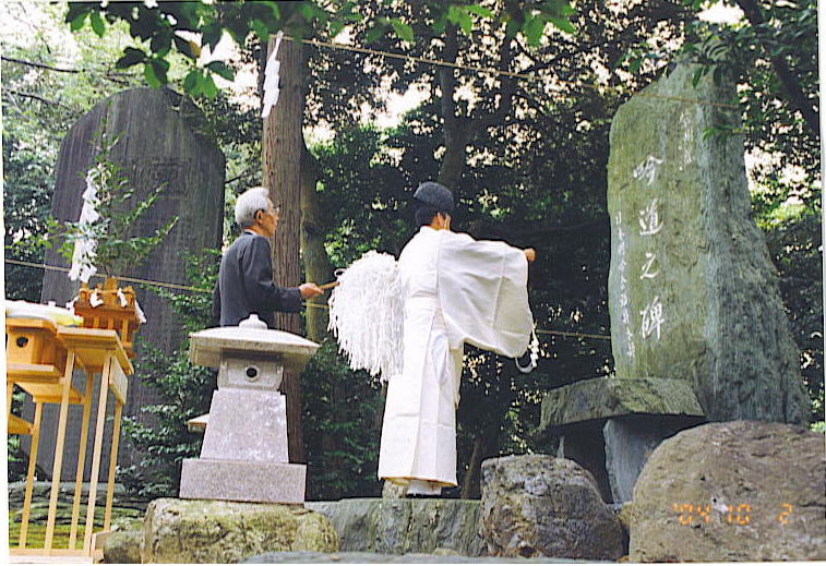 福井本部は、昭和32年に、故宮下紫城先生によって福井の地に誕生した。以来今日まで故宮下紫城先生が、流祖初代宗家 秦紫洲先生に永年師事し継承し得た吟法と吟譜を基に、紫洲流の吟詠の本道を踏み誤ることのないように、吟道の真髄をそのまま当地に根付きはぐくみ育てて来ました。 この写真は、平成十六年十月二日『吟道之碑鎮魂奉吟祭』(会員代表約100名が参加)の時のスナップです。 この吟道の碑は平成11年に建立し、吟友の心のよりどころとし、毎年亡き吟友の名を刻み、おもいを偲ぶようにしています。 建立場所は、福井市内の足羽山頂上近くの『足羽神社境内』にあります。 |